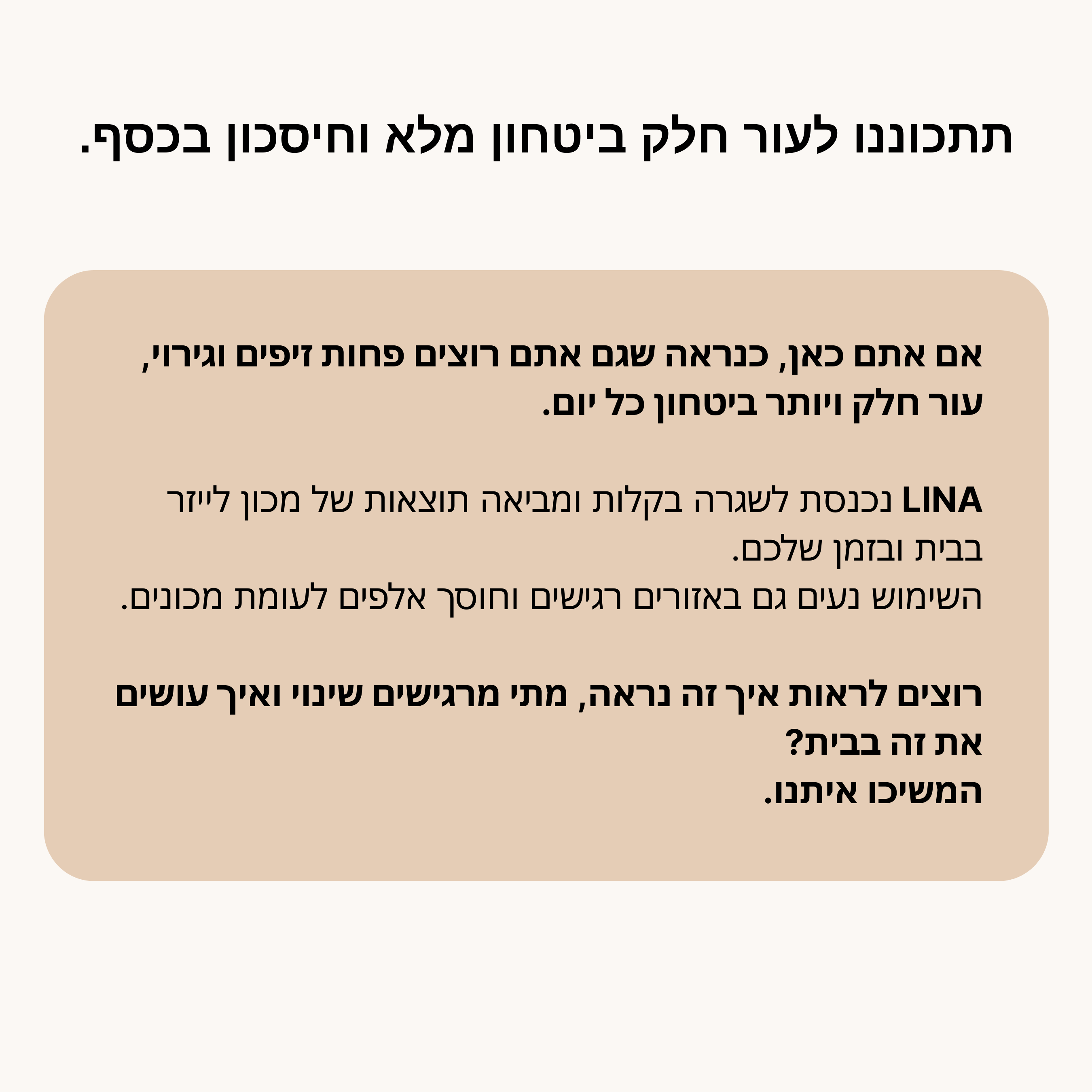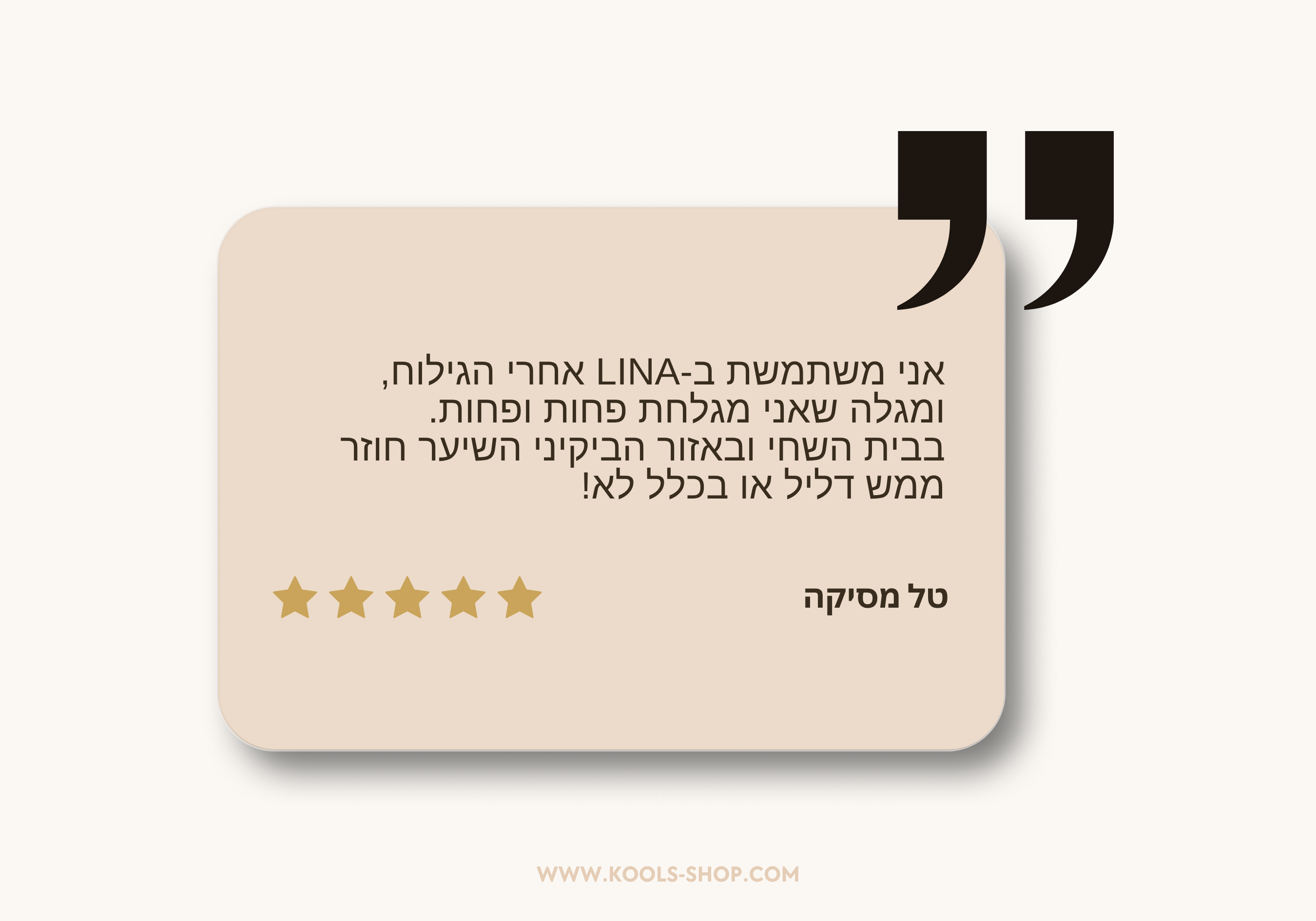 אנחנו מעניקים אחריות לשנה והחזר מלא עד 90 יום לכל רכישת LINA.