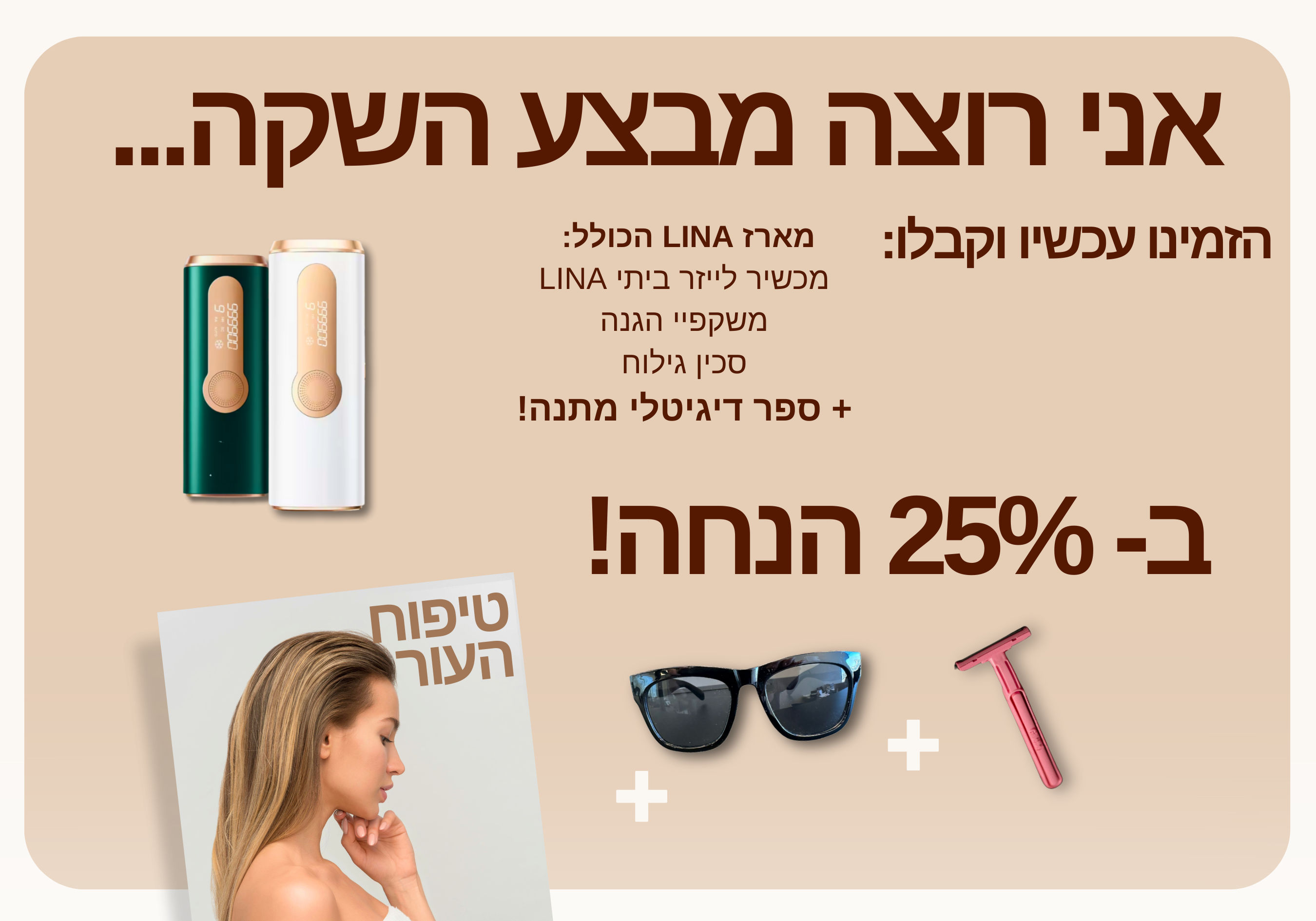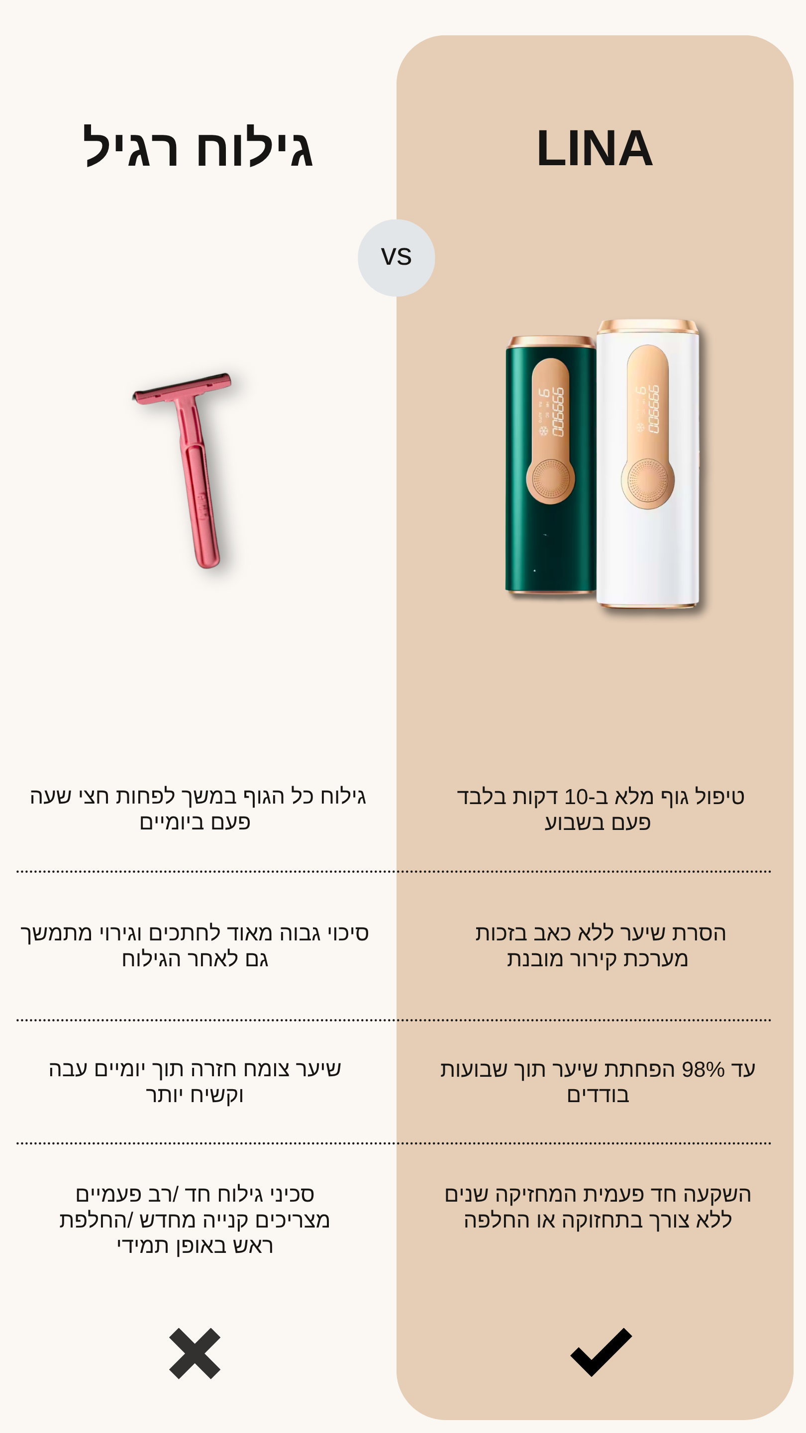 LINA הוא מכשיר ידני המכוון פולסי אור מדויקים לשורשי השערה ומשמיד אותם ללא שריפה או נזק לעור, ובכך מצמצם ומונע את צמיחת השיער מחדש לטווח הארוך.