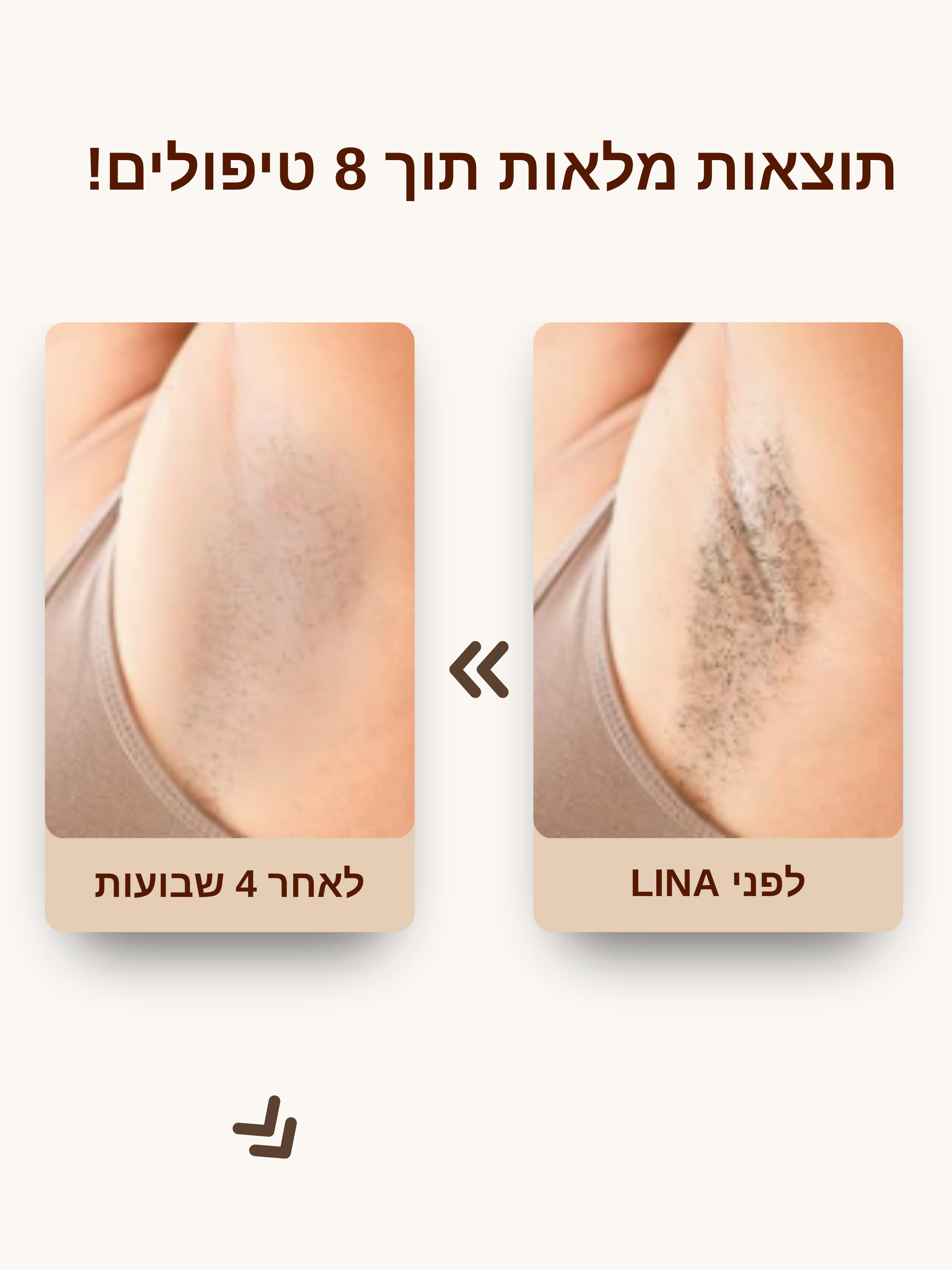 LINA מובילה להפחתה קבועה של צמיחת השיער. יחד עם זאת התוצאות משתנות מאדם לאדם. במידה ותבחינו בנקודות שיער מסויימות שצומחות בחזרה אתם תמיד יכולים להשתמש ב LINA לטאצ אפים נקודתיים לפי הצורך!